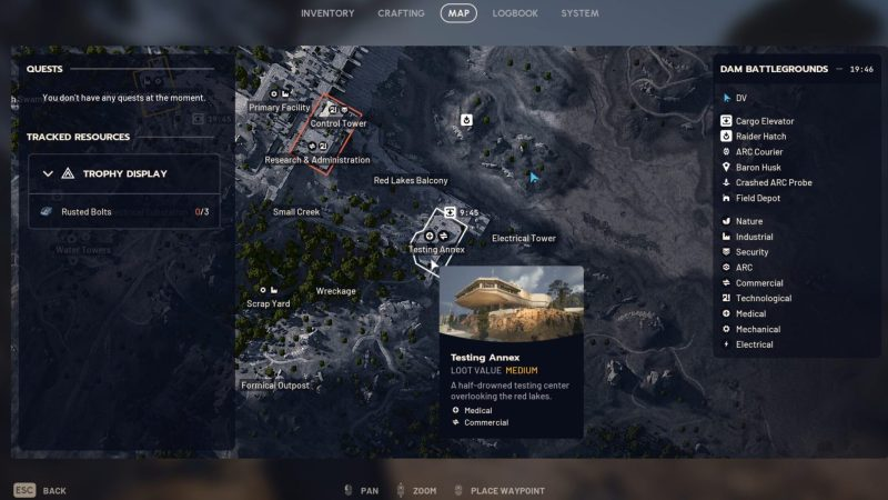After spawning, start by opening your map and making your way straight to the Testing Annex located in the southern section of the Dam battlegrounds.