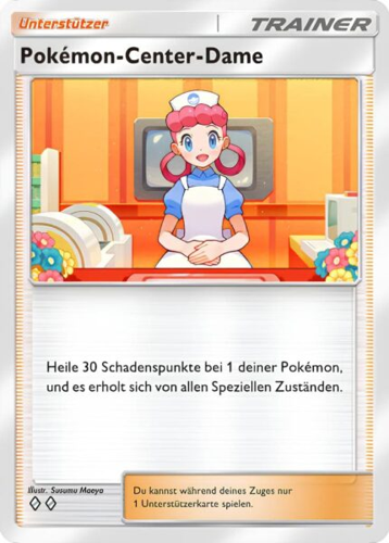 Die Pokémon-Center-Dame ermöglicht es dir, bei Mega-Flunkifer-EX 30 Schadenspunkte zu regenerieren und gleichzeitig alle speziellen Zustände aufzuheben.